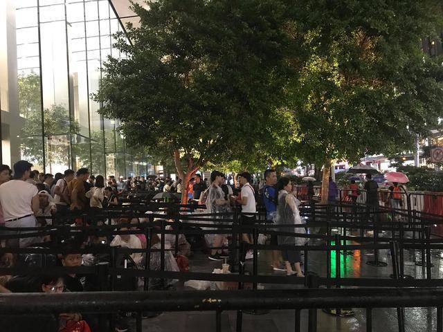 而傍晚近七点突然下起了大雨,果粉们在工作人员的安排下站在屋檐下避雨,但都没有离开队伍。