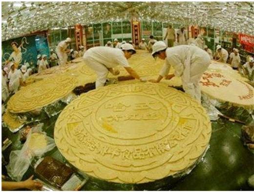 2007年的吉尼斯世界记录显示,世界上最大的月饼诞生于中国的沈阳,一款直径为8.15米,厚20厘米,总重约12.98吨的超大月饼。