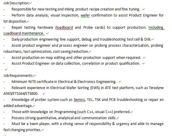 3、3年以上半导体厂或大型电子厂测试部门技术员经验, 包括在新加坡的经验;