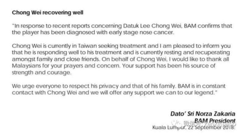 今天(9月22日)下午,李宗伟的官方脸书发布了他确诊早期鼻癌的消息。早期鼻癌的康复率为70%,这让大家送了口气。