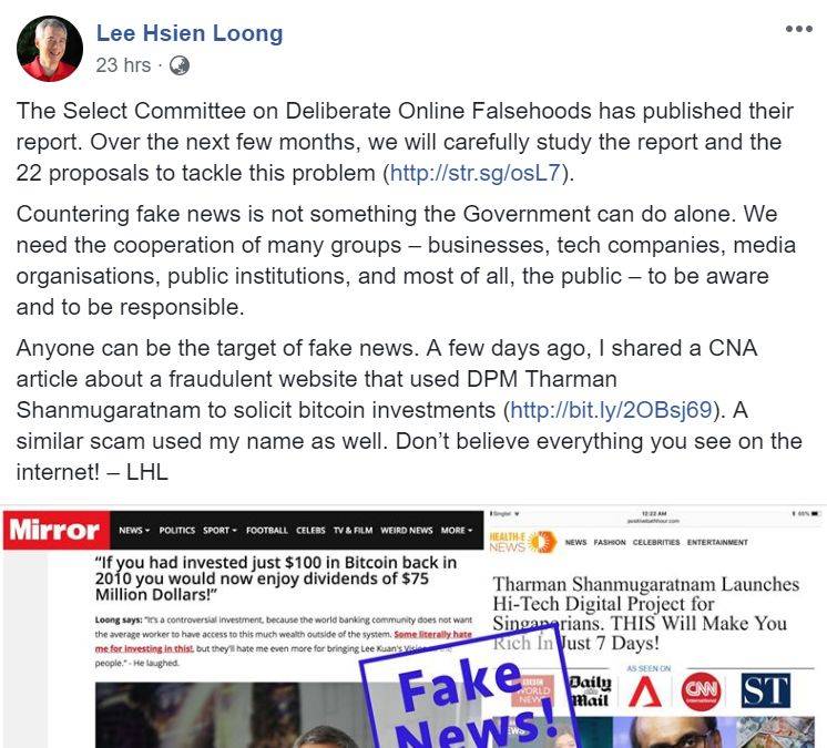 他也提到了任何人都可以成为假新闻的目标。例如前几天,就有诈骗网站以副总理尚穆根的名义招揽公众投资比特币。跟如今滥用李显龙总理的名义来说服群众投资比特币的手法如出一辙。