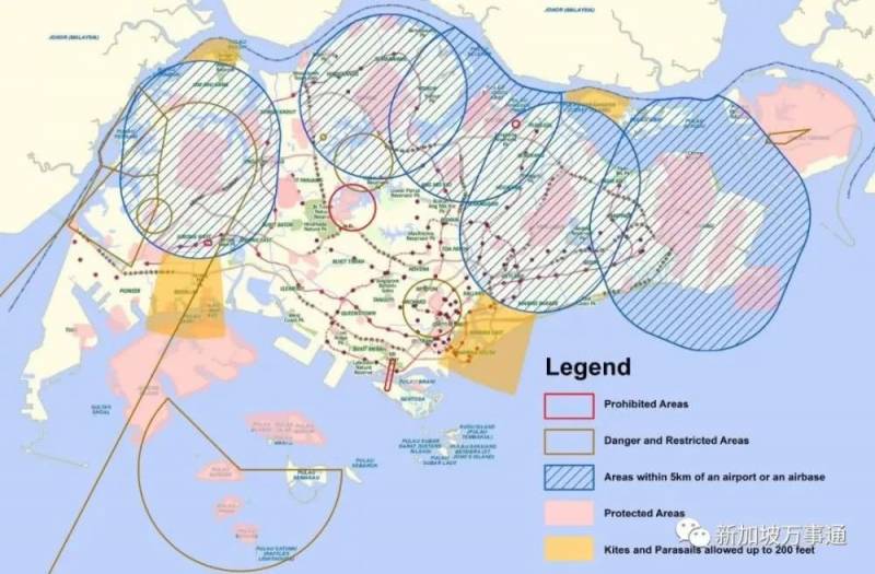 根据2015年,新加坡CAAS发布的新加坡无人机禁飞区,靠近机场或军用基地5公里范围内不能飞行无人机,这块区域是上图中的蓝色网状区域。我们能看到,榜鹅整个区域都在其中。换句话说,这名男子只是单纯在榜鹅飞无人机,就已经违法。
