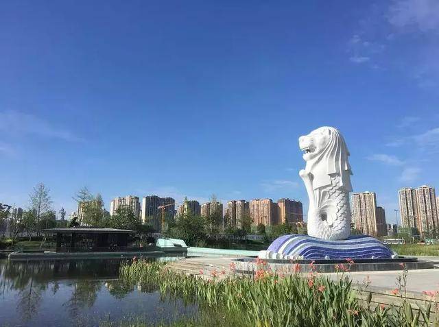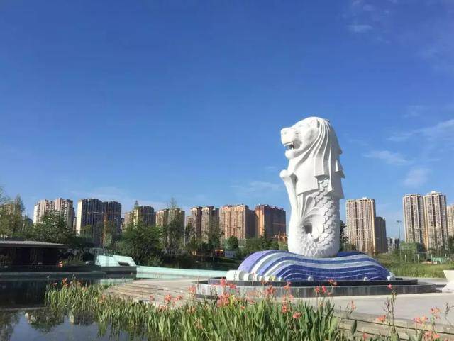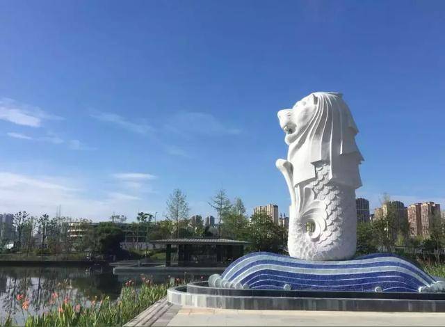 鱼尾狮塑像按照位于新加坡浮尔敦一号的新加坡城市地标——鱼尾狮公园中的鱼尾狮1:0.813同比缩小,总高7米,由主体、浪花和基座三部分组成。鱼尾狮正面朝向新川之心镜湖喷洒喷泉,喷泉扬程在16-22米之间。