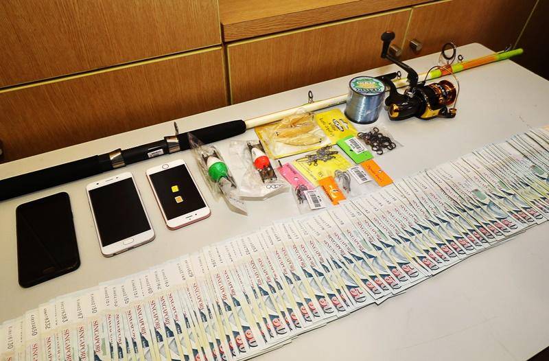 警方从周英汉乘坐的电动船起获的5000元现金、手机和钓鱼用具。(档案照)