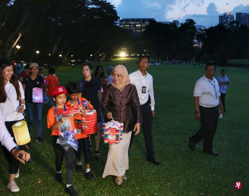 除了家庭团聚,哈莉玛总统也到场与孩童们聊天拍照。晚餐过后,大家提着灯笼,在义工的带领下参观天鹅池、日本公园及卓锦万黛兰园等总统府景点。