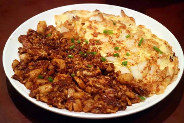 这家的萝卜糕,被切成长方条,混在蛋液中,入锅做成蚵仔煎状,也算煎蛋家族的新加坡表亲、或萝卜糕家族的南洋裙带了。这货被煎得焦黄香脆,入口除了萝卜糕清甜鲜美外,还有蛋黄咸香浓郁,嚼一嚼软糯可口,砸吧嘴香嫩鲜美,最好味不过。