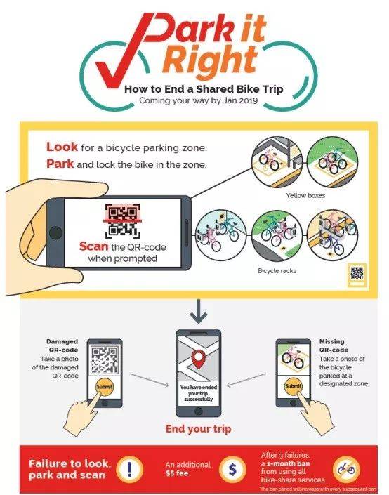 需要注意的是,如果用户胡乱停放共享脚踏车,且没有扫描二维码,持有经营执照的共享脚踏车业者将可以向他们扣除5新币的费用。如果一年内违例至少三次,将被禁止使用共享脚踏车长达一年时间。