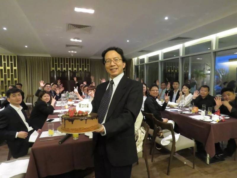 新加坡国立大学商学院全方位管理课程学术主任黄幸亮教授手捧蛋糕与学员们共庆课程开办100届
