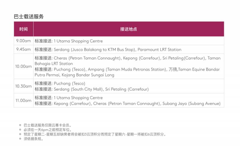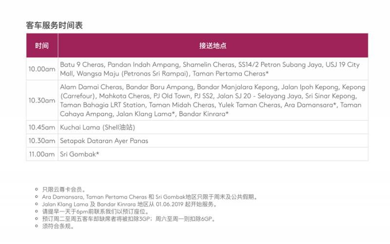 接送地点包括Cheras、Puchong 、Kuchai Lama、 1 Utama、 Serdang、Subang Jaya、Wangsa Maju、PJ SS2 等等。