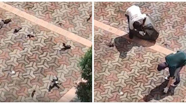 网民Suraiyah Abdulla在Facebook页面上载一段长2分多钟的视频显示,楼下一块空地上,有一群鸽子在吃地上的食物,瞬间鸽子开始不断地在挣扎,身体也慢慢地不再移动,逐一倒在地上。而在不远处,站着约六位在观察鸽子动静的人员,当鸽子不再动弹时,其中两名戴着口罩的人员拿着塑料袋,把鸽子一只一只捡起,放进袋里。