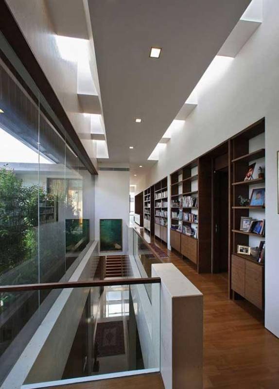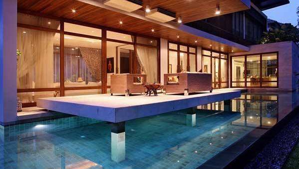 一个石阳台连接客厅到游泳池和主卧室悬臂在游泳池,