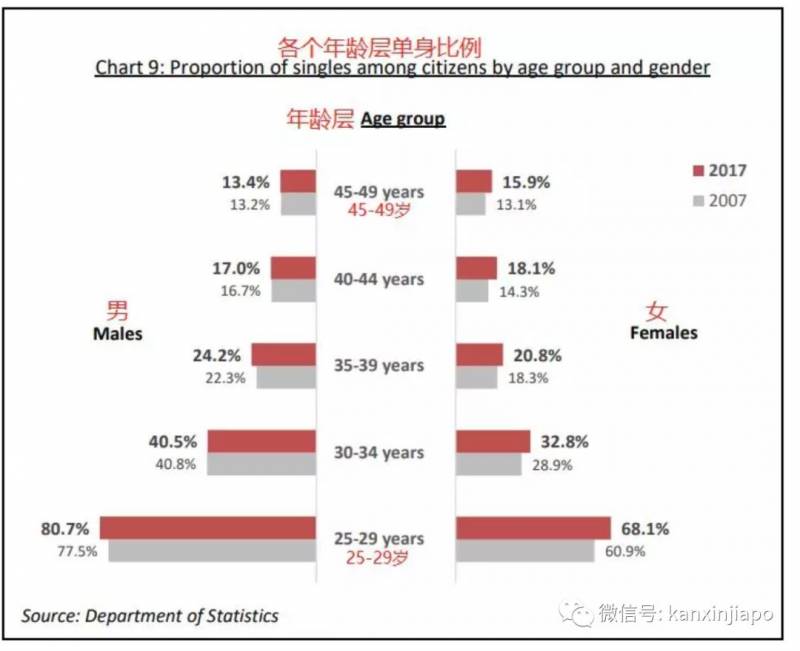 新加坡各年龄段的单身人数,对比十年前都有所增加。特别是25岁到29岁的年轻人是重灾区!这群人当中,80.7%的男子单身,而68.1%的女子单身。