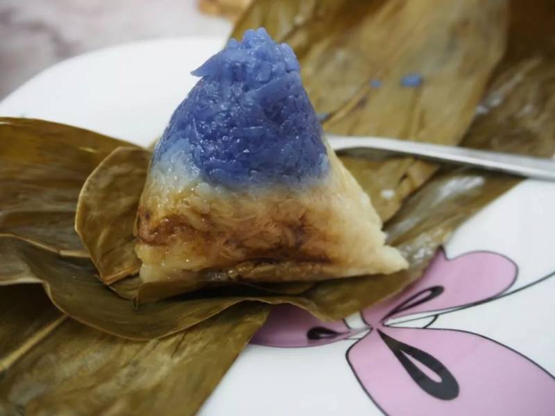 娘惹粽又称蓝粽。制作的时候用蝶豆花(蓝花)将米粒染蓝,从而粽子色泽湛蓝,宛如青花瓷,光看便赏心悦目。