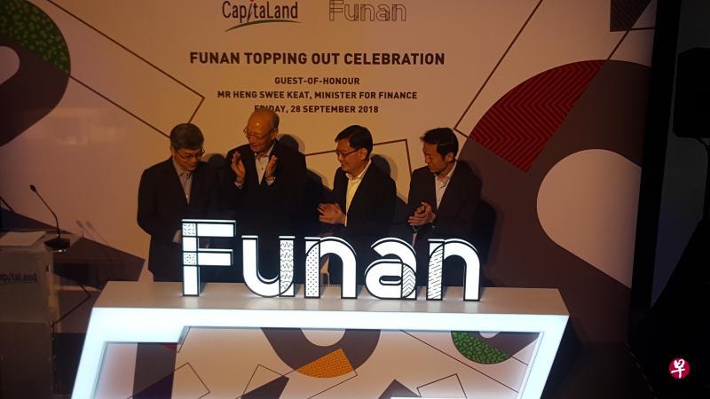 (左起)凯德商用新加坡信托管理执行长陈志雄、凯德集团主席黄记祖、财政部长王瑞杰和凯德总裁兼执行长李志勤一起福南综合项目主持盖顶仪式。(李蕙心摄)