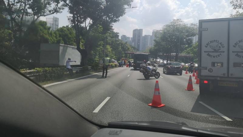 从过路网民上传通讯应用程序Telegram群组的照片可见,受事故影响,道路的第二道第四条车道均用路锥围起,后方车辆需绕道而行。