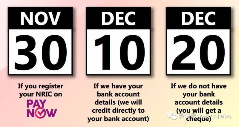 如果政府有公民个人的银行账户信息,这笔钱将在12月10日,打入银行账户。如果没有银行账户信息的话,12月20日新加坡政府将把支票送到个人手中。