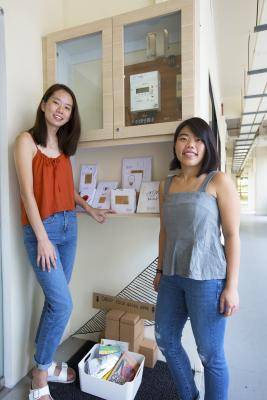 宋俐滢(左)和官佩颖希望更多人参与神秘书的免费交换活动。公众要捐书,可以直接放进书柜下的“篮子”。