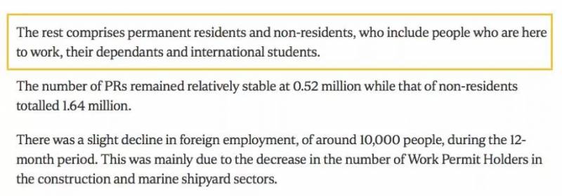 非居民人口,也就是除了公民和PR,持有长期准证(如各类工作准证、学生准证、家属准证)的有164万4400人。比2017年的164万6500人减少了2100人。