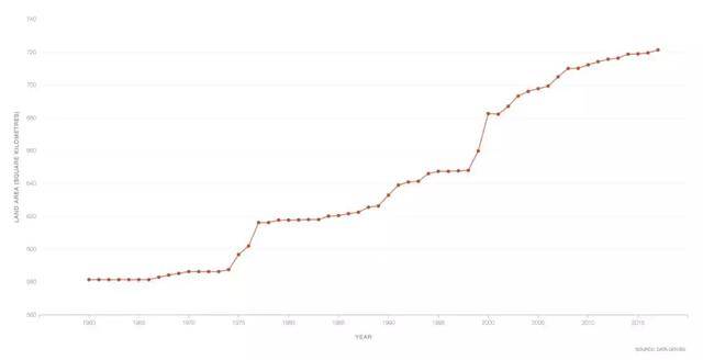 这是一张显示新加坡自1960年代以来土地面积增加的图表: