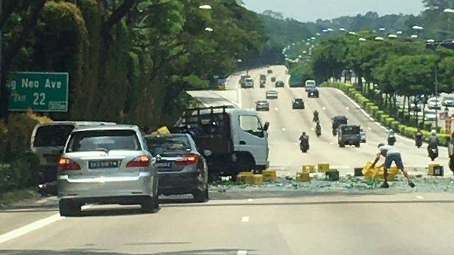 泛岛快速公路朝裕廊方向,在靠近英娘道出口处,发生了一起涉及运货罗里和一辆货车的交通事故。装有酒瓶的啤酒箱从罗里掉落,玻璃碎片洒落一地。