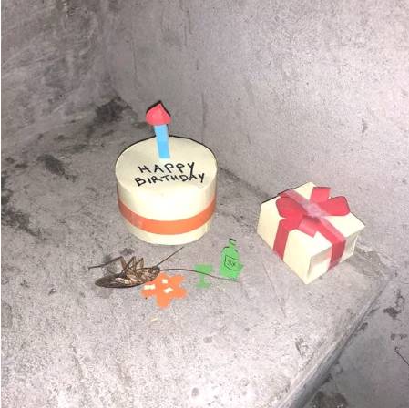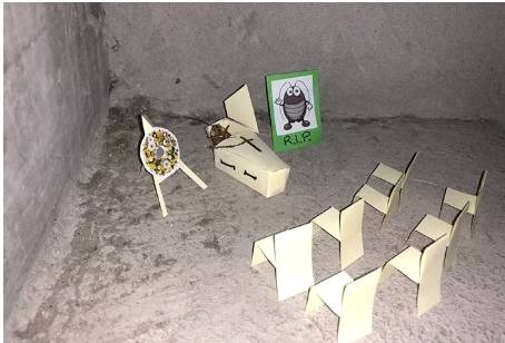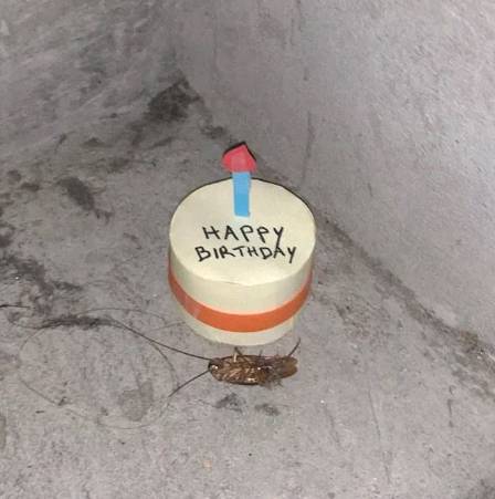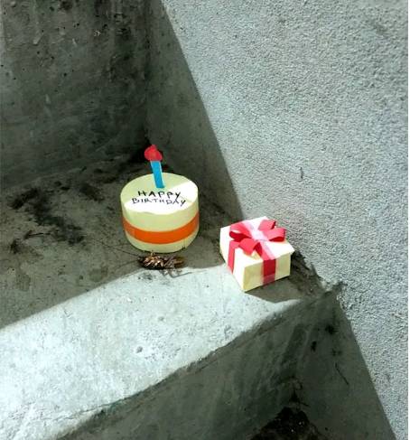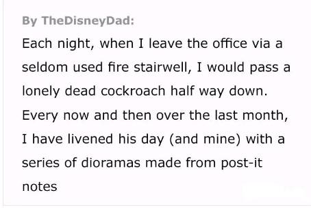 “每天晚上,我离开办公室,走那个没什么人用的消防楼梯,在半路,总能看到一只孤独的死蟑螂。上个月,我时不时在它身边放一些用便利贴做的小模型,非常欢乐了”。