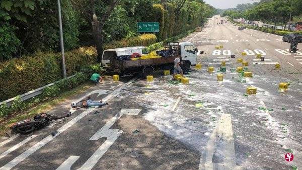《联合早报》接获读者发来的照片显示,涉及车祸的一辆罗厘当时载满瓶装啤酒。意外发生后,车斗上的啤酒瓶洒落一地,三条车道满地玻璃碎片,一片狼藉。