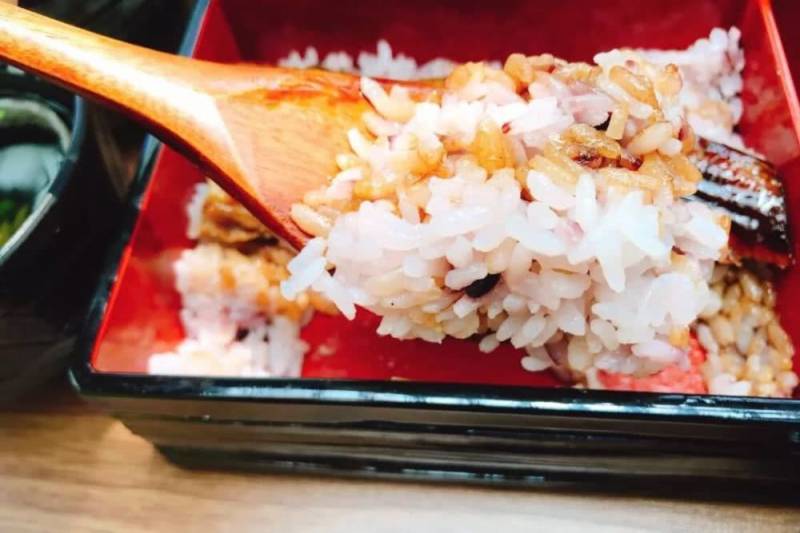 宫川家特制的烤鳗鱼酱配了烤鳗鱼和米饭一起拌匀了吃。
