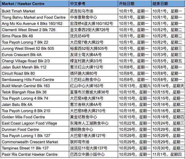 10月,国家环境局(NEA)仍将继续对食阁进行例行的大清扫。清扫期间,以下食阁将在这些日期里不营业。清扫时间主要集中在10月1日、8日、15日、29日这几天。