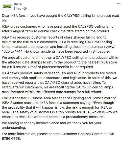 宜家新加坡已发表声明,将召回一款CALYPSO天花板灯!