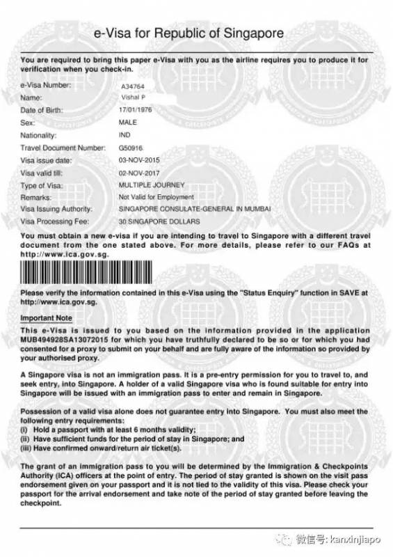 (新加坡电子签证样本)