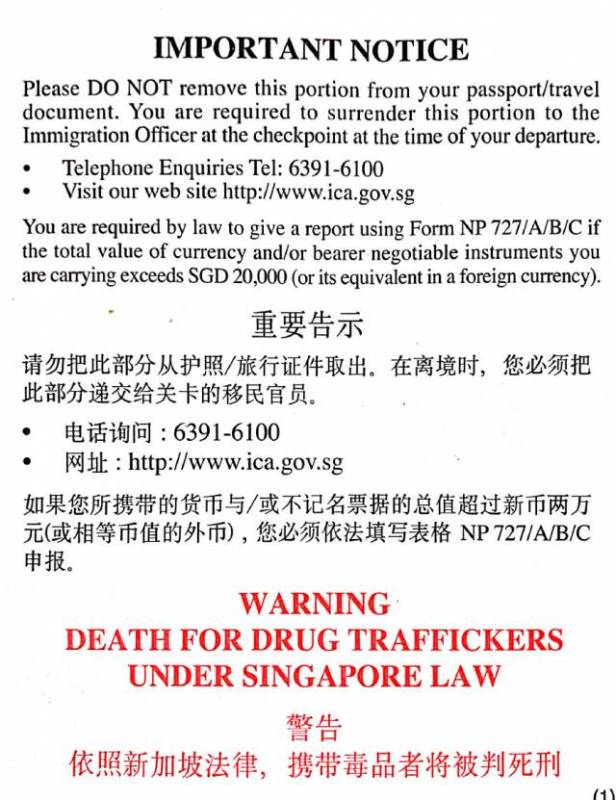 另外,在卡的背面,还有一条很重要的告示,却经常被人忽略。入境新加坡不能带大量现金,要少于两万元新元(或相等币值外币)。如果超限,就需要老老实实填写表格,向移民局申报啦。