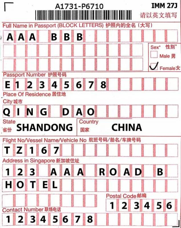 每位入境新加坡,且没有有效长期居留准证的旅客(包括小孩),必须填写一张出入境表格。所有内容必须用蓝笔或黑笔,以英文大写(每格一个字母)填写。不懂英文也没关系,2017年最新版的入境卡上加了中文翻译。