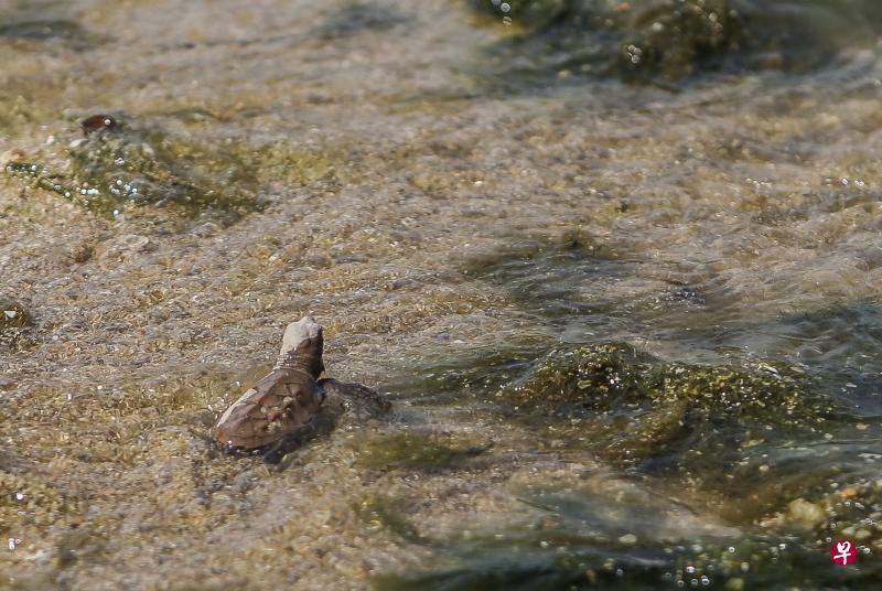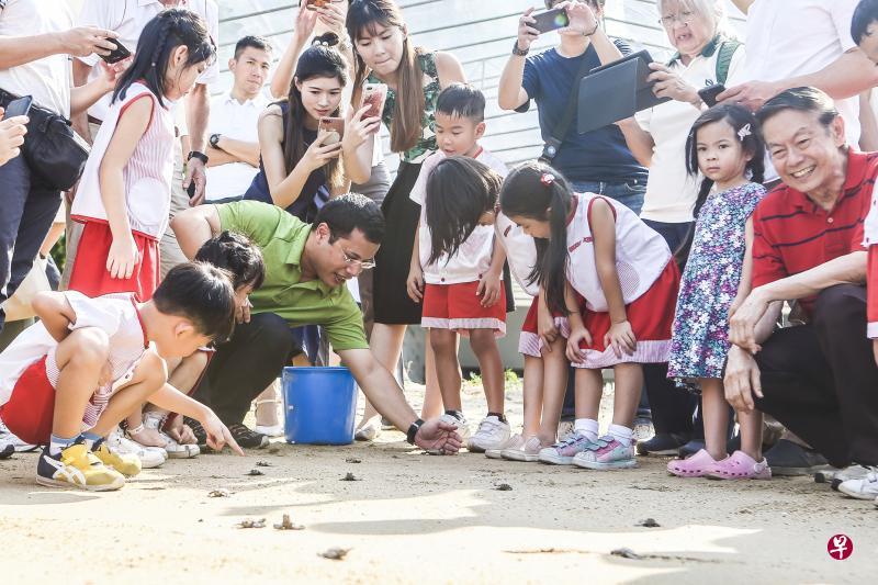 社会及家庭发展部长兼国家发展部第二部长李智陞昨天出席海龟孵化场开幕仪式。昨早刚好有10多只幼龟孵化,李智陞在国家公园局人员协助下,将这些幼龟放入大海。