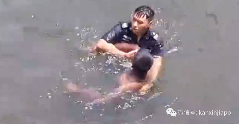 网上有这么一段视频,一个男子在河道中,旁边有个警察在架着他,把他往岸边带,而岸上的警察则把救生圈抛向他们。