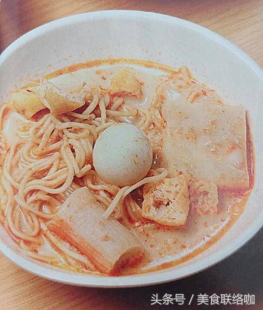 2、客人下单后,取拉面40克煮熟、装碗,舀入叻沙汤50克,放鱼糕片、蟹肉棒、豆腐泡、虾仁、鹌鹑蛋各1个即可。