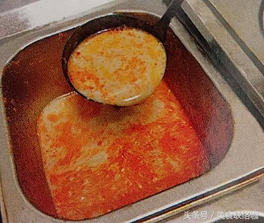 3、锅入红油100克烧至五成热,下步骤1做好的混合料、泰国虾膏120克炒出香味,倒入步骤2熬好的汤中,加椰浆5斤、三花淡奶400克、柠檬汁50克搅匀,加少许盐补味熬透即成。