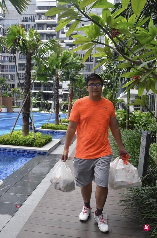陈善龙每周末都替义顺两座公寓的居民当“免费送餐员”。(曾美玲 摄)