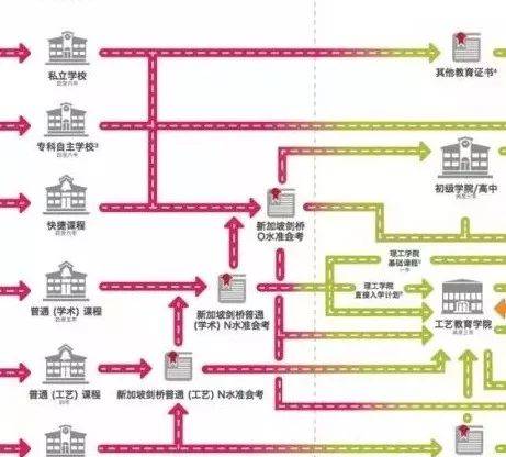 新加坡多元化的升学路径。新加坡的中学提供三项不同源流的课程,根据学生的小学离校考试 (PSLE) 成绩,孩子将被分配到三类学校:快捷(包括一些学校所提供的综合课程)、普通(学术)或普通(工艺)课程。