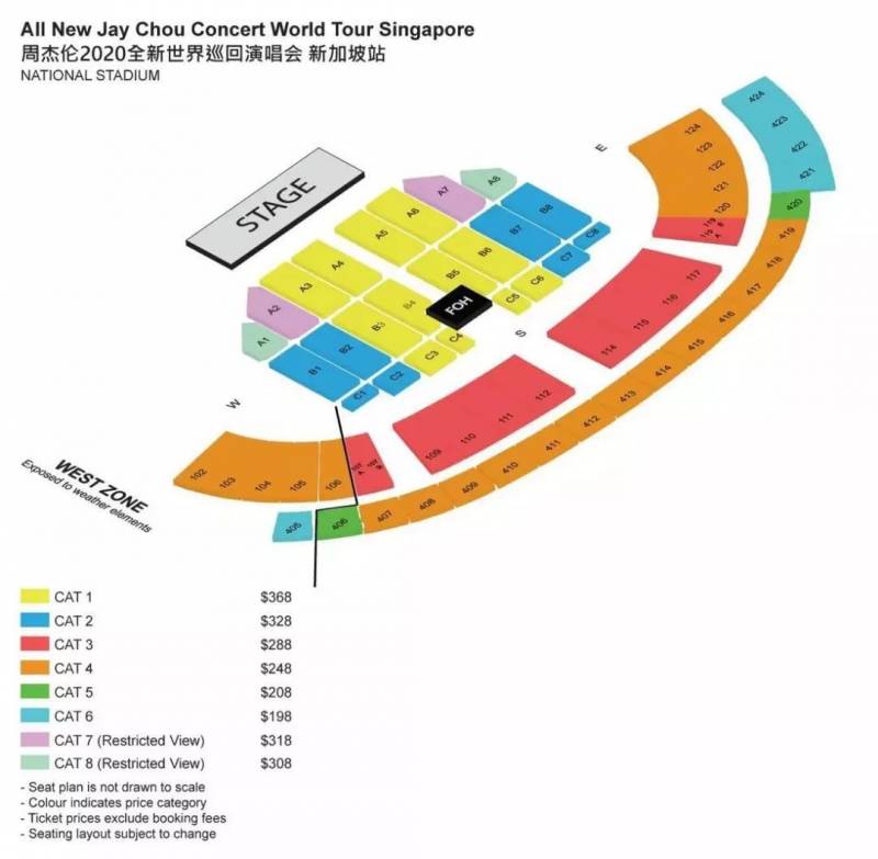 票价分为$368, $328, $318, $308, $288, $248, $208 和 $198 (未含$4 手续费)