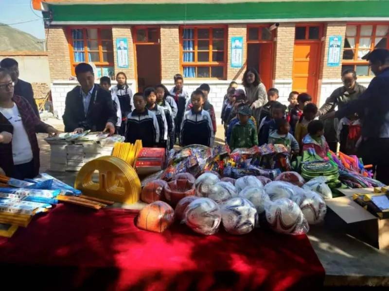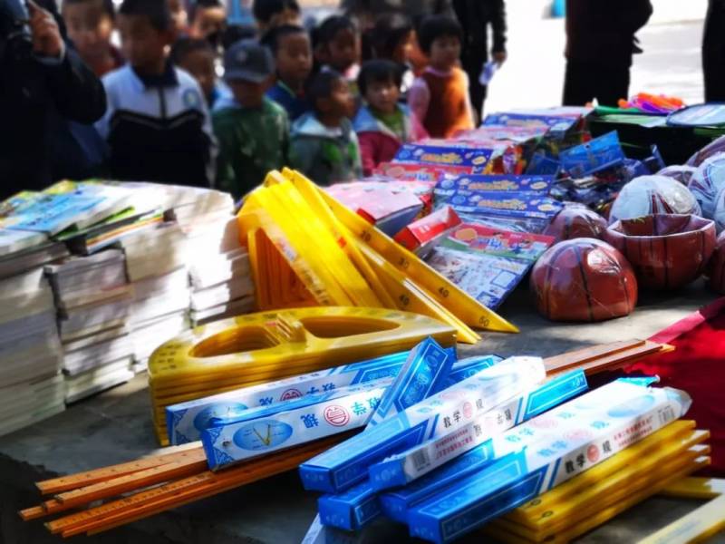 给曹家台小学所捐赠的这些教学用品包括有篮球、足球、跳绳、呼啦圈、体操垫子、羽毛球拍、桌球拍、毽子、打气筒、积木、幼儿读本、儿童读本、教学用计算器、教师用三角板、教师用圆规、教师用米尺等等,希望孩子们能德智体美全面发展。