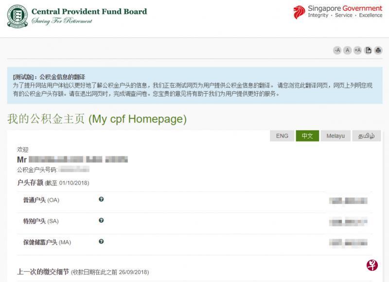 公众今后登录公积金局网站查看公积金存款时,可点选华文,网页就会以华文内容显示存款资料。(公积金局网站截图)