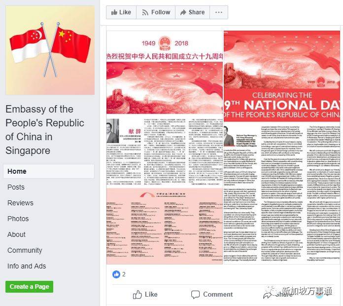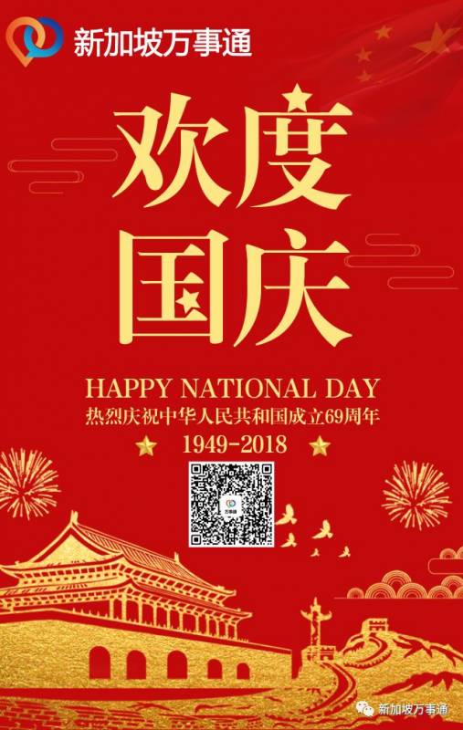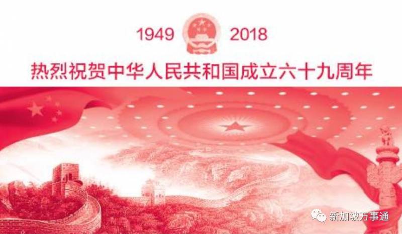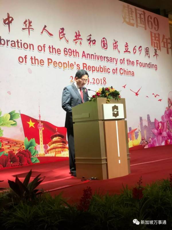 “今天,中华人民共和国迎来69岁华诞。中国驻新加坡大使馆全体工作人员与在新加坡工作、学习和生活的中国同胞共享节日的喜悦,共同祝福伟大的祖国,并向长期支持中新友好关系发展的新加坡各界朋友致以衷心的感谢。