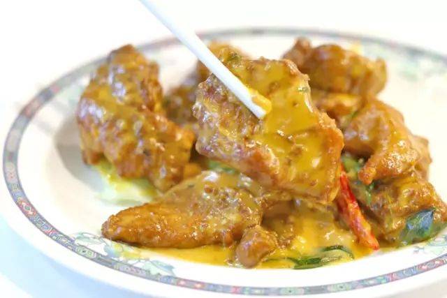 虽说是猪肋排但是基本上不带骨,浓稠适中的咸蛋酱包裹着金黄的猪肋排,咬一口就是满口的肉与咸蛋黄,好幸福。