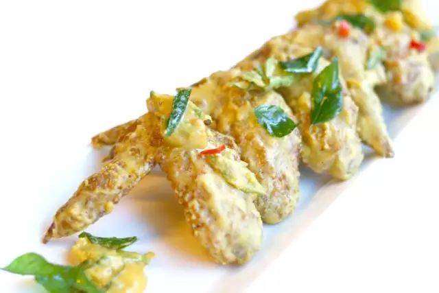鸡翅先用咖喱粉腌制过,然后再裹上加入了咖喱叶和小辣椒的咸蛋黄酱,简直停不下来。