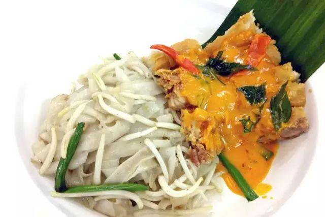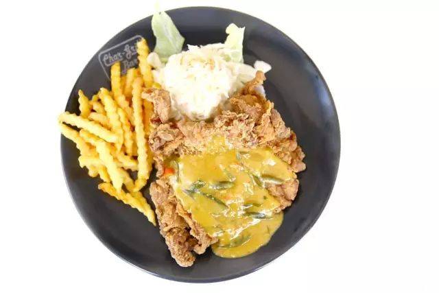 咸蛋黄是很多马来人很爱的食物,所以马来菜式里或多或少都会有咸蛋黄菜式出现。这道素炒河粉看起来平平无奇,但是加上炸鸡排搭配咸蛋黄酱就再也不普通。