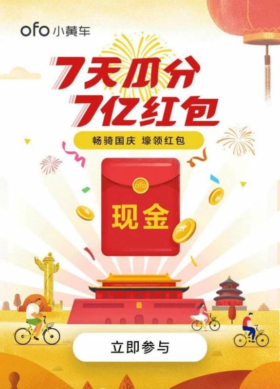 9月29日,ofo宣布将在10月1日至7日期间,上线主题为“7天瓜分7亿现金”的送豪礼活动。用户在10月1日-7日的ofo “7天瓜分7亿现金”活动期间,只要完成“骑行任务”和“分享任务”,就可获得两次大额现金红包奖励机会。