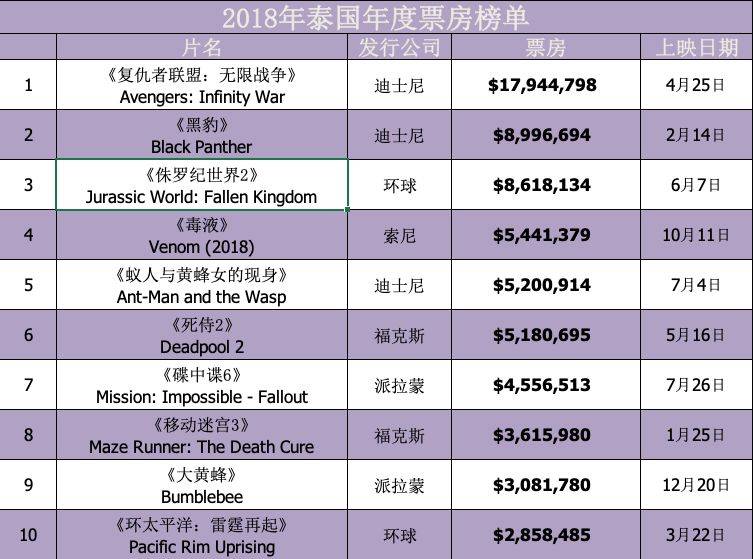 泰国电影局(The Thailand Film Office)1月份的报道称,2018年有74部国际合拍片在泰国拍摄,并且国际制片公司开始从最近公布的15%退税中获得奖励,只要这些国际合拍公司在当地的制片消费超过5000万泰铢(合160万美元)。