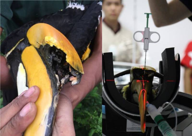 裕廊飞禽公园一只患有癌症的双角犀鸟,在医疗团队联手下成功切除患癌盔突,并装上一个量身打造的3D打印人造盔突。该只犀鸟目前康复情况乐观。