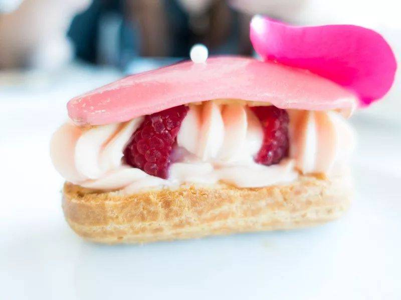 君君推荐鸡肉和培根派,酥脆的外皮,培根、鸡肉和黄油结合在一起的美味。甜品Ispahan是一道粉红色甜点,带有淡淡的荔枝玫瑰奶油和新鲜的覆盆子。