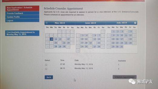 顺利过帐之后就可以预约面试日期和时间了,建议周末不要去预约。工作日每天中午就会放出最近的可选择日期和时间,我是星期一中午预约到星期二早上的面试时间。